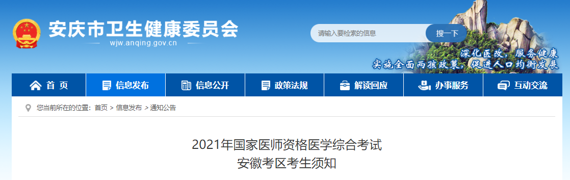 安徽考區(qū)安慶考點衛(wèi)健委發(fā)布了2021年國家醫(yī)師資格醫(yī)學綜合考試安徽考區(qū)考生須知的公告,相信這是廣大考生們關注的事情,醫(yī)學教育網(wǎng)小編整理官方公告如下: