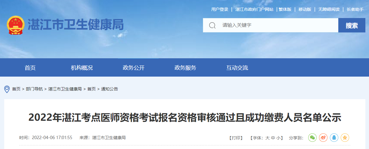 根據(jù)國家和省關(guān)于2022年醫(yī)師資格考試工作的安排,2022年醫(yī)師資格考試考生報名資格審核工作已結(jié)束。經(jīng)考點審核及考區(qū)復(fù)核,湛江考點共3484名考生符合報考條件且成功繳費,現(xiàn)將名單予以公示。公示期間,如報考人員對報名資格有異議,請在公示期內(nèi)向我局醫(yī)政科如實反映情況。