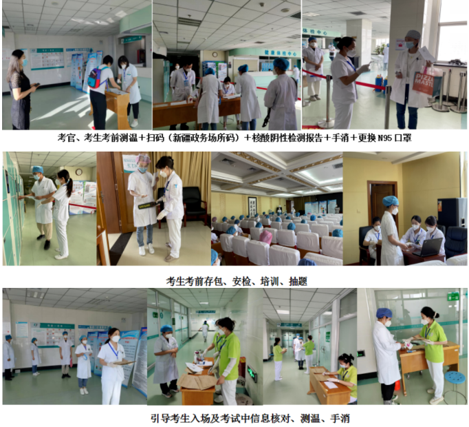 考試期間,考試基地嚴(yán)格落實(shí)國(guó)家2022年醫(yī)師資格考試工作會(huì)議精神,統(tǒng)籌做好我基地考務(wù)和新冠肺炎疫情防控工作,確保疫情防控常態(tài)化下烏魯木齊考點(diǎn)醫(yī)師資格考試實(shí)踐技能考試科學(xué)、公平、安全、規(guī)范進(jìn)行,確保廣大考生和涉考工作人員“零感染”,按照國(guó)家《2022年醫(yī)師資格考試新冠肺炎防控指引》和《2022年醫(yī)師資格考試新冠肺炎防恐應(yīng)急預(yù)案》、自治區(qū)《2022年醫(yī)師資格實(shí)踐技能考試基地疫情防控實(shí)施方案》、市疫情防控指揮部《關(guān)于進(jìn)一步壓實(shí)“四方責(zé)任”,從嚴(yán)從緊落實(shí)常態(tài)化疫情防控措施》的文件要求和通知,結(jié)合口腔執(zhí)業(yè)醫(yī)考試實(shí)踐技能考試基地實(shí)際,制定了《2022 年國(guó)家醫(yī)師資格實(shí)踐技能考試烏魯木齊市口腔醫(yī)院溫泉分院考點(diǎn)(口腔類別)疫情防控有關(guān)方案》和《2022年醫(yī)師資格考試實(shí)踐技能考試基地應(yīng)急方案》,同時(shí)根據(jù)疫情防控政策新要求,嚴(yán)格落實(shí)“測(cè)溫+戴口罩+掃碼(新疆政務(wù)場(chǎng)所碼)+核酸陰性結(jié)果”要求,所有考生、考官及考務(wù)人員需提供新疆政務(wù)場(chǎng)所碼、行程碼、全市統(tǒng)一頻次內(nèi)有效核酸檢測(cè)陰性結(jié)果報(bào)告,安排所有考官及考務(wù)人員每日核酸檢測(cè),所有考生、考官及考務(wù)人員全部更換由考試基地提供的N95口罩并要求全程佩戴;考前、考后對(duì)基地進(jìn)行全面徹底消毒;設(shè)置隔離考室以及隔離觀察點(diǎn),制定特殊情況處置流程,組織疑似人員隔離、轉(zhuǎn)運(yùn)演練;設(shè)置疫情防控應(yīng)急保障組,對(duì)考試期間發(fā)熱考生、突發(fā)事件等能快速反應(yīng)、有效處置;考試期間,對(duì)于特殊考生開(kāi)辟綠色通道,專人引導(dǎo),為每一名考生能夠安全順利完成考試保駕護(hù)航。