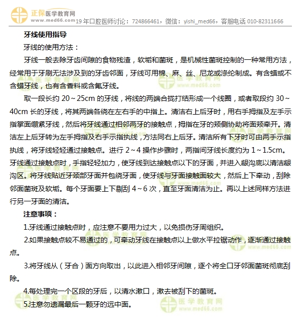 關(guān)于“牙線的使用指導(dǎo)——口腔執(zhí)業(yè)助理醫(yī)師實踐技能考點”,為幫助大家進一步掌握有關(guān)考點,醫(yī)學(xué)教育網(wǎng)編輯整理具體資料如下:
