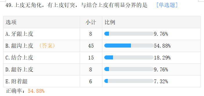 上皮無角化,有上皮釘突,與結(jié)合上皮有明顯分界的是?此題全國口腔醫(yī)師???strong>正確率54.88%。各位考生經(jīng)過了緊張的報名審核,現(xiàn)階段應(yīng)該收心復(fù)習(xí)了,醫(yī)學(xué)教育網(wǎng)為您精心挑選了50道模擬測試題,快來測測你的水平吧!立即免費參與>>