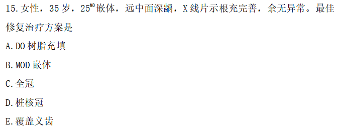 【答案解析】患牙MO嵌體,又有遠(yuǎn)中面齲,形成MOD缺損,對于前磨牙而言,缺損過大,牙冠剩余組織抗力不足,不宜采取充填、嵌體修復(fù)。即使采取全冠修復(fù),也可能發(fā)生冠折。正確的方法是適當(dāng)去除薄弱牙體組織,進(jìn)行樁核冠修復(fù),覆蓋義齒的修復(fù)效果顯然不如樁核冠。