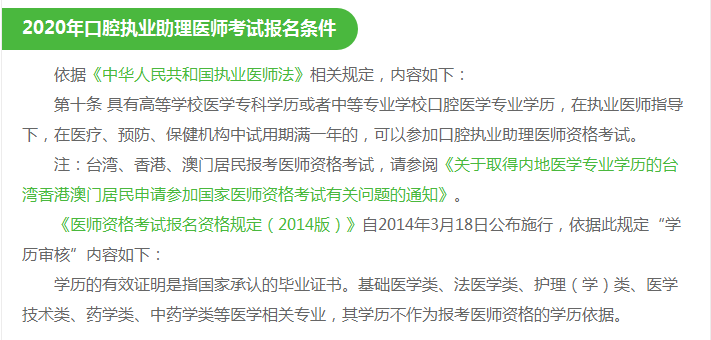 具有高等學(xué)校醫(yī)學(xué)??茖W(xué)歷或者中等專業(yè)學(xué)??谇会t(yī)學(xué)專業(yè)學(xué)歷,在執(zhí)業(yè)醫(yī)師指導(dǎo)下,在醫(yī)療、預(yù)防、保健機(jī)構(gòu)中試用期滿一年的,可以參加口腔執(zhí)業(yè)助理醫(yī)師資格考試。