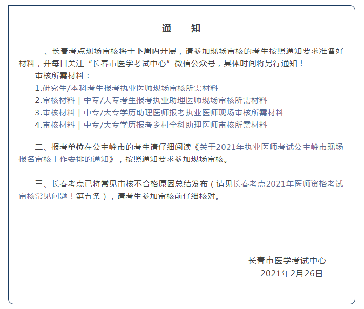 一、長春考點現(xiàn)場審核將于下周內(nèi)開展,請參加現(xiàn)場審核的考生按照通知要求準備好材料,并每日關(guān)注“長春市醫(yī)學(xué)考試中心”微信公眾號,具體時間將另行通知!