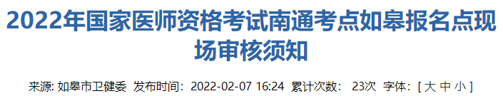江蘇考區(qū)南通考點(diǎn)如皋報(bào)名點(diǎn)2022年醫(yī)師資格考試現(xiàn)場(chǎng)報(bào)名相關(guān)事項(xiàng)通知