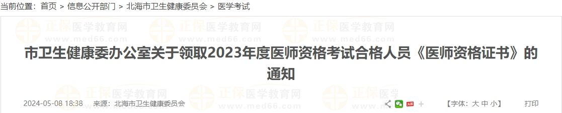 廣西北海市關(guān)于領(lǐng)取2023年度醫(yī)師資格考試合格人員《醫(yī)師資格證書》的通知已發(fā)布,請各單位派員持單位委托書及委托人個人有效身份證件原件,于5月9日至5月24日期間到北海市醫(yī)學(xué)考試中心統(tǒng)一領(lǐng)取。醫(yī)學(xué)教育網(wǎng)小編為大家整理通知如下:
