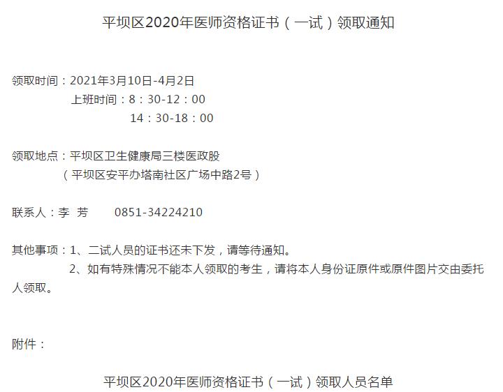 平壩區(qū)2020年醫(yī)師資格證書(一試)領(lǐng)取通知