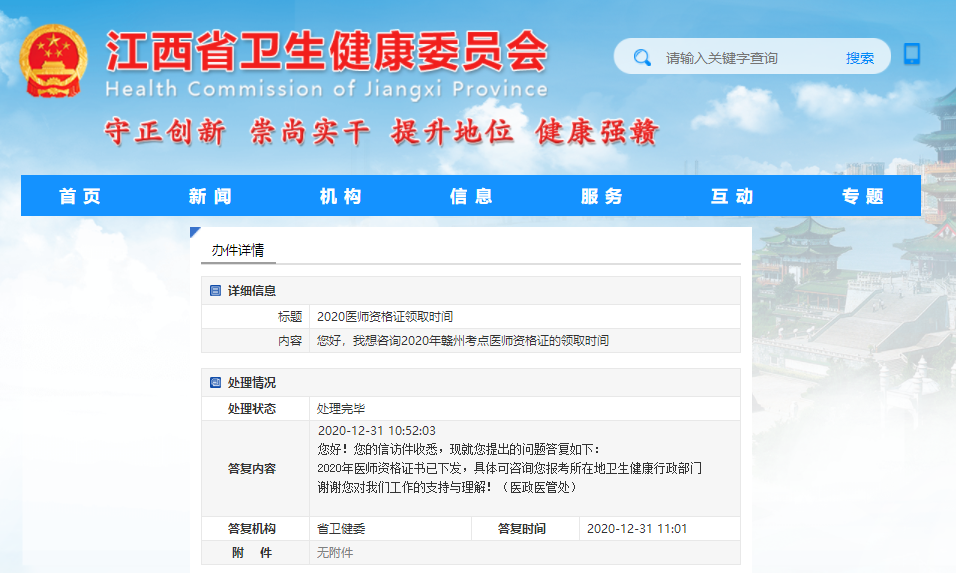 提問:您好,我想咨詢2020年贛州考點醫(yī)師資格證的領取時間