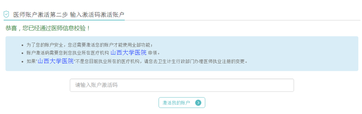 安全驗證完成后,請聯(lián)系您主要執(zhí)業(yè)機構(gòu)的負(fù)責(zé)人,醫(yī)療機構(gòu)會發(fā)送激活碼至您的手機或郵箱。正確填入激活碼后,點擊【激活我的賬戶】。