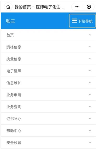 3、在醫(yī)師個(gè)人端,點(diǎn)擊右上角【下拉導(dǎo)航】中的【業(yè)務(wù)申請(qǐng)】