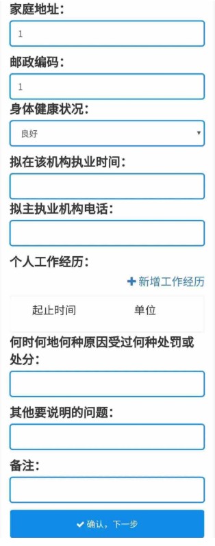 2、填寫業(yè)務(wù)信息,變更資格請(qǐng)選擇“是”,選擇變更后注冊(cè)要使用的資格,變更執(zhí)業(yè)地點(diǎn)請(qǐng)選擇“是”(由助理的縣區(qū)級(jí)區(qū)劃選擇為省級(jí)行政區(qū)劃),變更主執(zhí)業(yè)機(jī)構(gòu)選擇“是”,按照要求填寫其他申請(qǐng)內(nèi)容,填寫完成后,點(diǎn)擊“確認(rèn),下一步”