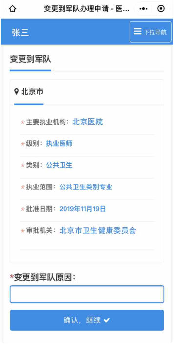 4、輸入“變更到軍隊原因”,然后點擊【確定,繼續(xù)】,完成變更到軍隊業(yè)務(wù)提交。