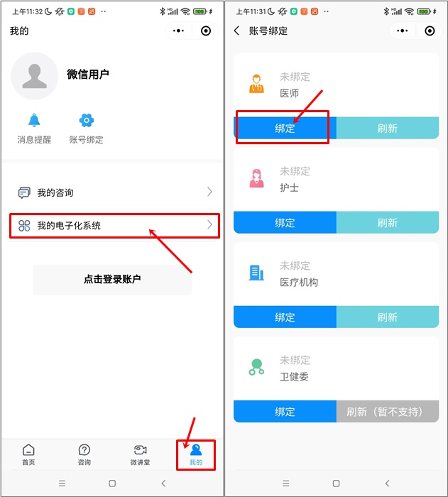 * 綁定電子化賬號(hào)僅支持已經(jīng)完成醫(yī)師電子化注冊(cè)的用戶使用。還未進(jìn)行電子化注冊(cè)的用戶,請(qǐng)先完成新用戶的注冊(cè)。
