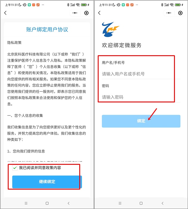 ③進(jìn)入“歡迎綁定微服務(wù)”界面,輸入您在醫(yī)師電子化注冊(cè)系統(tǒng)中的【用戶名/手機(jī)號(hào)】和【密碼】后,點(diǎn)擊【綁定】。