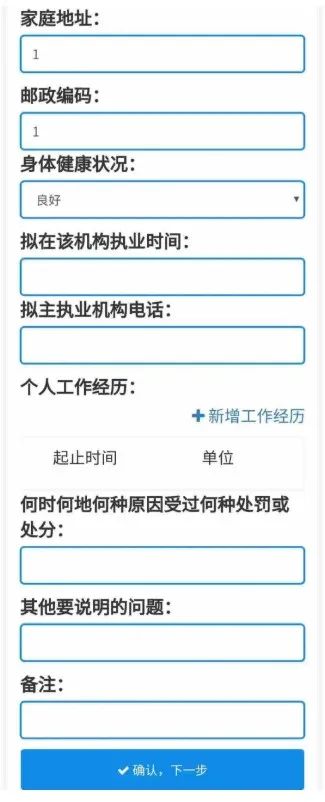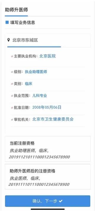 2、填寫業(yè)務(wù)信息,變更資格請(qǐng)選擇“是”,選擇變更后注冊(cè)要使用的資格,變更執(zhí)業(yè)地點(diǎn)請(qǐng)選擇“是”(由助理的縣區(qū)級(jí)區(qū)劃選擇為省級(jí)行政區(qū)劃),變更主執(zhí)業(yè)機(jī)構(gòu)選擇“是”,按照要求填寫其他申請(qǐng)內(nèi)容,填寫完成后,點(diǎn)擊“確認(rèn),下一步”