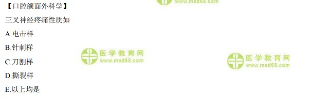 【答案解析】本病的主要表現(xiàn)是在三叉神經(jīng)某分支區(qū)域內(nèi),驟然發(fā)生閃電式的極為劇烈的疼痛,疼痛如電擊、針刺、刀割或撕裂樣。【醫(yī)學(xué)教育網(wǎng)原創(chuàng)】