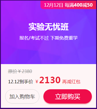 該優(yōu)惠僅限于“爽”12當天,只要課程價格是400的a倍,那么最終就會立減a×50!以口腔主治醫(yī)師實驗無憂班為例,原價是2380,爽十二活動價為2130,但是這并不是最終的購買價格哦,大家繼續(xù)往下看。