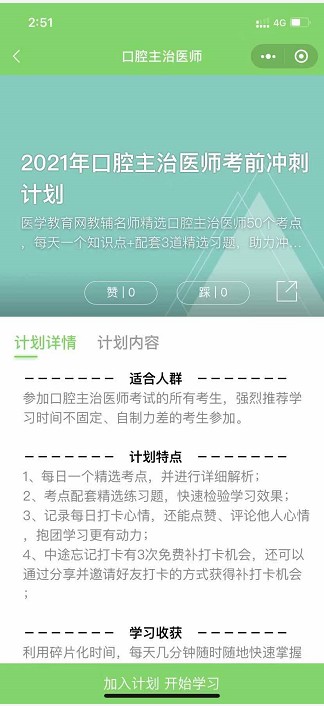 第三步:請選擇“您的備考計(jì)劃”,如“2021口腔主治醫(yī)師考前沖刺計(jì)劃”,點(diǎn)擊下方“加入計(jì)劃開始學(xué)習(xí)”