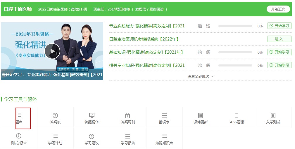 登錄學(xué)員代碼,進(jìn)入我的網(wǎng)校我的家-我的課程,在“學(xué)習(xí)工具與服務(wù)”中,點擊題庫。
