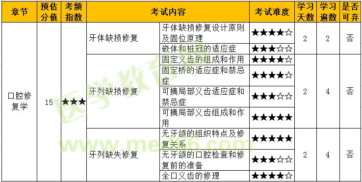 「專業(yè)知識-口腔修復學」考點難度&學習計劃