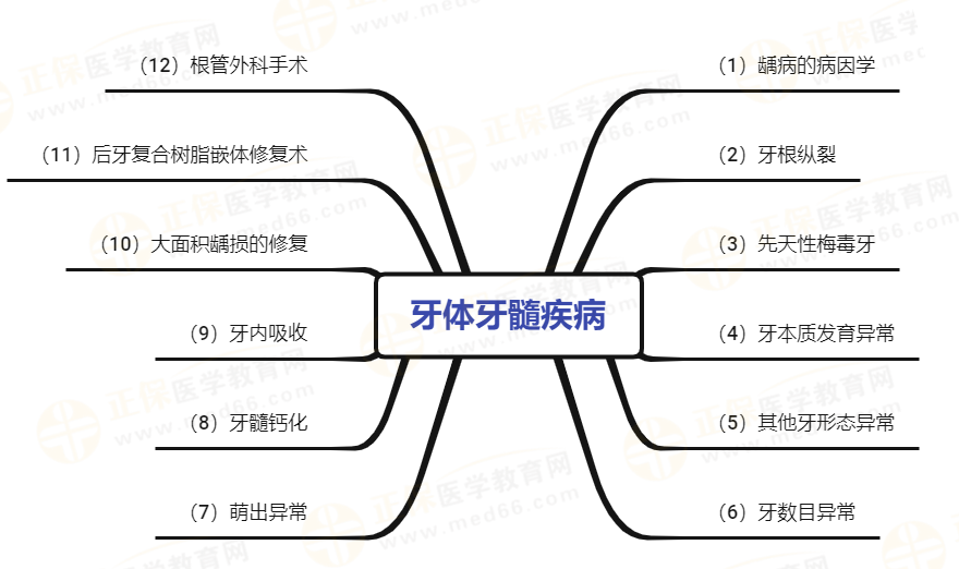 口腔主治醫(yī)師相關(guān)專業(yè)知識(shí)考試中會(huì)涉及【牙體牙髓病學(xué)】的內(nèi)容,為了幫助各位考生更好地復(fù)習(xí),醫(yī)學(xué)教育網(wǎng)為大家整理【牙體牙髓病學(xué)】知識(shí)點(diǎn)地圖如下: