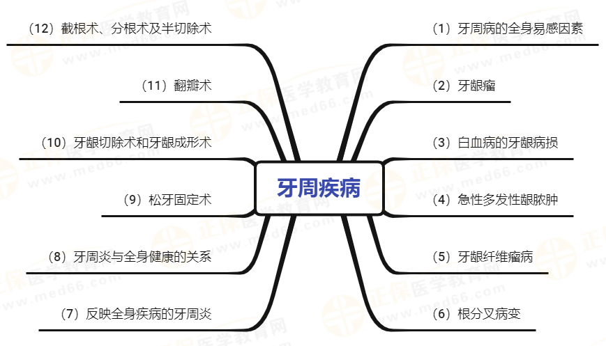 口腔主治醫(yī)師相關專業(yè)知識考試中會涉及【牙周疾病】的內容,為了幫助各位考生更好地復習,醫(yī)學教育網為大家整理【牙周疾病】知識點地圖如下: