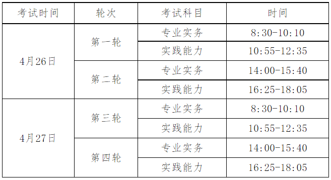 考試分為4輪次進(jìn)行,每半天為一個輪次,考生將隨機(jī)分配至其中一個輪次參加專業(yè)實(shí)務(wù)和實(shí)踐能力兩個科目的考試,具體考試時間以準(zhǔn)考證為準(zhǔn)??荚嚥捎萌藱C(jī)對話形式,試題均為客觀題,題量為120問??忌稍凇皥罂贾改稀睓谀肯螺d《人機(jī)對話考試系統(tǒng)演示視頻》熟悉操作。