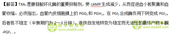 PGI2是腺苷酸環(huán)化酶的重要興奮劑,使cAMP生成增加,從而抑制血小板聚集和擴張血管。因此,TXA2和PGI2在血小板和血管的相互作用中形成一對生理作用完全相反的調控系統(tǒng)。阿司匹林因其抑制了環(huán)氧化酶,從而抑制了TXA2的生成,發(fā)揮抑制血小板聚集的作用。