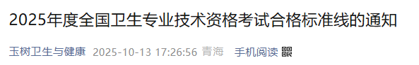 根據(jù)青海省衛(wèi)生健康委《關(guān)于公布2025年度高級衛(wèi)生專業(yè)技術(shù)資格考試合格標(biāo)準(zhǔn)及相關(guān)事項的通知》、青海省人力資源和社會保障廳國家衛(wèi)健委醫(yī)師資格考試委員會《關(guān)于公開2025年度衛(wèi)生專業(yè)技術(shù)資格考試(初、中級)合格標(biāo)準(zhǔn)的通知》(青人社廳函〔2025〕322號)文件精神,現(xiàn)將玉樹州2025年度全國衛(wèi)生專業(yè)技術(shù)資格考試合格標(biāo)準(zhǔn)分?jǐn)?shù)線(國家級、省級)通知如下: