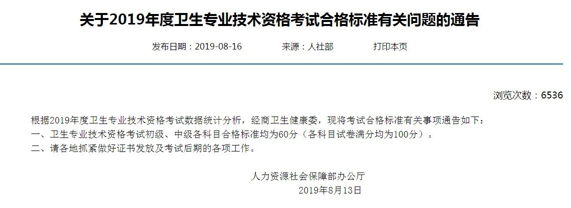 根據(jù)小編從中華人民共和國人力資源和社會保障部了解到,2019年度衛(wèi)生專業(yè)技術(shù)資格考試合格標(biāo)準(zhǔn)已經(jīng)公布,通知內(nèi)容小編整理如下: