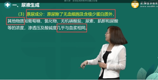 原尿成分:原尿除了無(wú)血細(xì)胞及含極少蛋白質(zhì)外,其他物質(zhì)如葡萄糖、氯化物、無(wú)機(jī)磷酸鹽、尿素、肌酐和尿酸等的濃度,滲透壓及酸堿度幾乎與血漿相同。