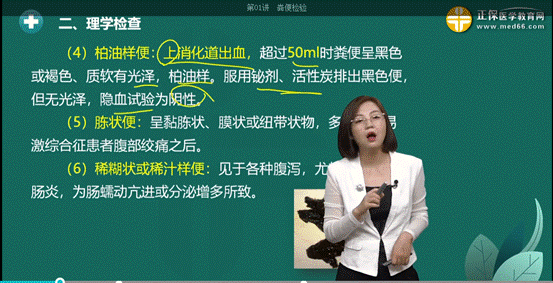 柏油樣便:上消化道出血,超過50ml時糞便呈黑色或褐色,質(zhì)軟有光澤,柏油樣。服用鉍劑、活性炭排出黑色便,但無光澤,隱血試驗為陰性。