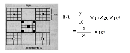 0.38mlE稀釋液+20μl血→混勻→充池→靜置3~5min→計數(shù)(低倍鏡,兩個池,10個大方格)→計算