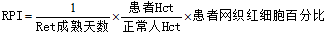 是網織紅細胞生成相當于正常人的倍數(shù)。通常Ret生存期限約為2d,若未成熟網織紅細胞提前釋放入血,Ret生存期限將延長,為了糾正網織紅細胞提前釋放引起的偏差,用RPI來反映Ret生成速率。計算公式為: