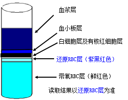 離心后血液分為5層,自上而下分別為血漿層、血小板層、白細(xì)胞層和有核紅細(xì)胞層、還原紅細(xì)胞層(紫黑紅色)、帶氧紅細(xì)胞層(鮮紅色)。