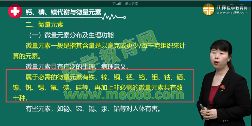1.微量元素一般是指其含量是以毫克或更少/每千克組織來(lái)計(jì)算的元素。微量元素具有廣泛的生理、病理意義。屬于必需的微量元素有鐵、鋅、銅、錳、鉻、鉬、鈷、硒、鎳、釩、錫、氟、碘、硅等,再加上非必需的微量元素共有數(shù)十種。有些元素,如鉍、銻、鎘、汞、鉛等對(duì)人體有害。