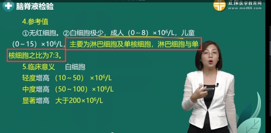 腦脊液顯微鏡檢查:①無紅細胞。②白細胞極少,成人(0~8)×106/L,兒童(0~15)×106/L,主要為單個核細胞,淋巴細胞與單核細胞之比為7:3。