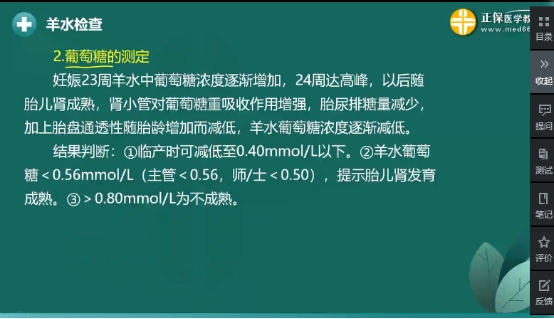 妊娠23周羊水中葡萄糖濃度逐漸增加,24周達(dá)高峰,以后隨胎兒腎成熟,腎小管對葡萄糖重吸收作用增強(qiáng),胎尿排糖量減少,加上胎盤通透性隨胎齡增加而減低,羊水葡萄糖濃度逐漸減低。
