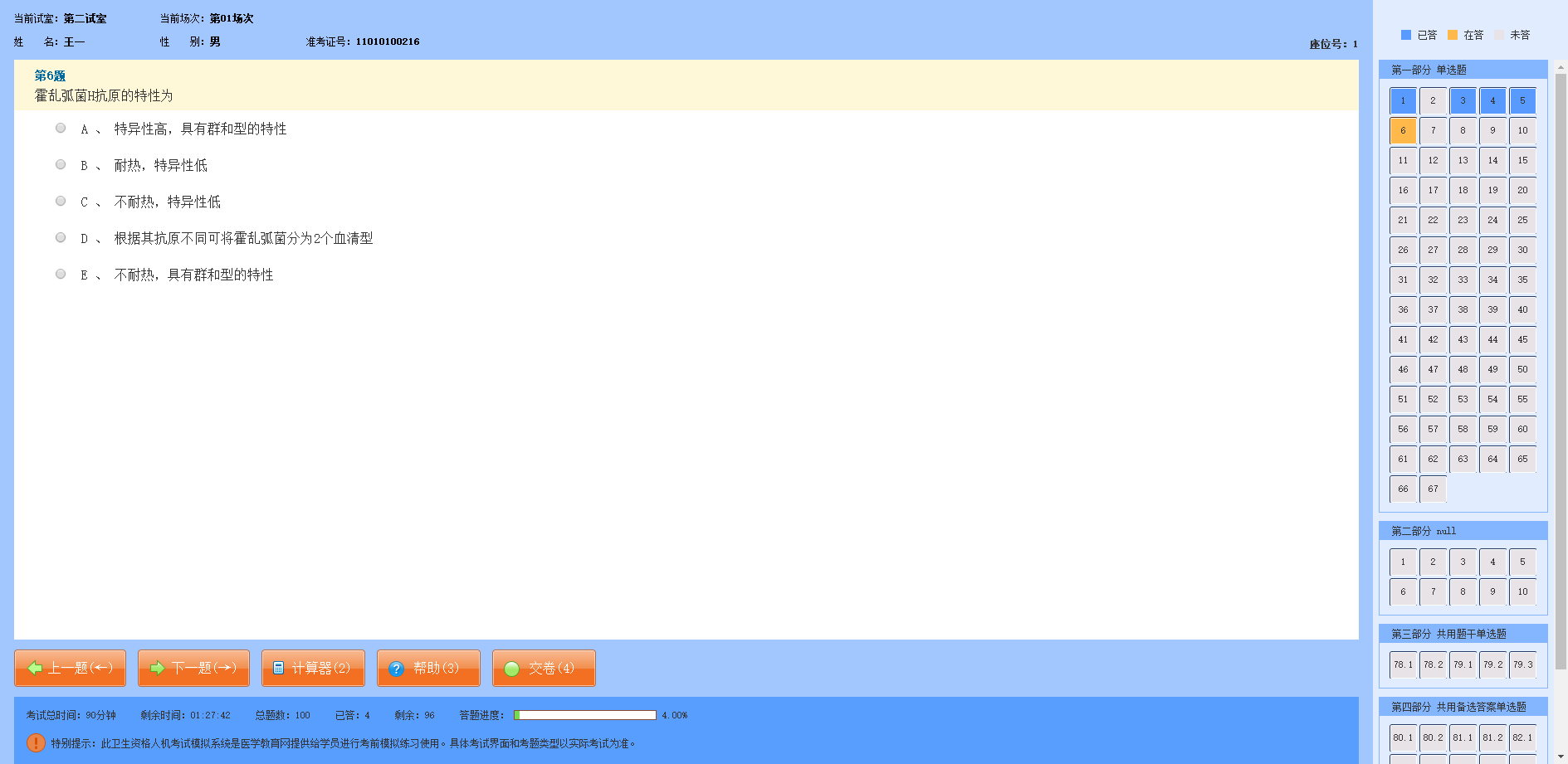 如上圖所示,已經(jīng)作答的題目顯示是藍(lán)色,未作答的題目顯示是灰色的,正在作答的題目顯示是橙色標(biāo)記。需要注意的是在檢驗(yàn)職稱考試中考生需按題號(hào)順序作答,一個(gè)題型答完在接著答其他題型,不能回跳題型。