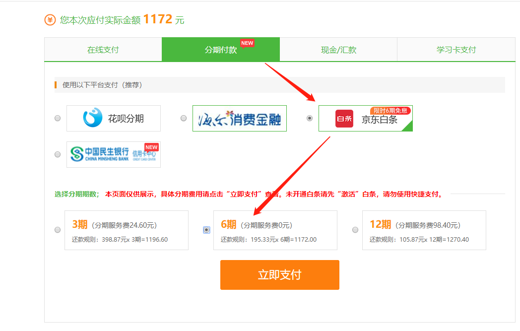 在支付頁(yè)面,選擇分期付款-京東白條進(jìn)行支付,分期期數(shù)一定要選擇6期哦!