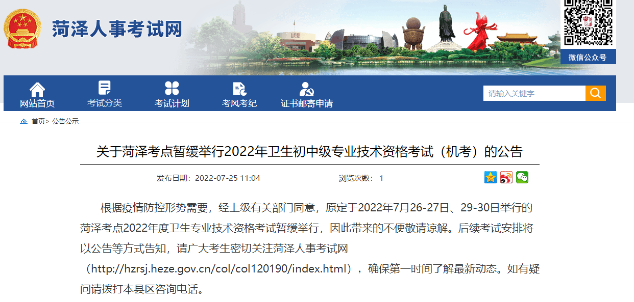 山東菏澤考點(diǎn)2022年檢驗(yàn)職稱考試暫緩舉行