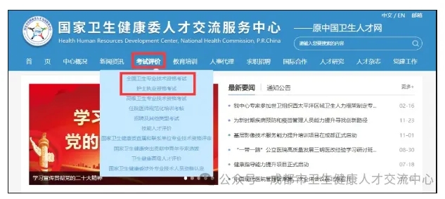 登錄國(guó)家衛(wèi)生健康委人才交流服務(wù)中心網(wǎng)站(www.21wecan.com),在“考試評(píng)價(jià)”欄目?jī)?nèi)選擇相應(yīng)的考試。