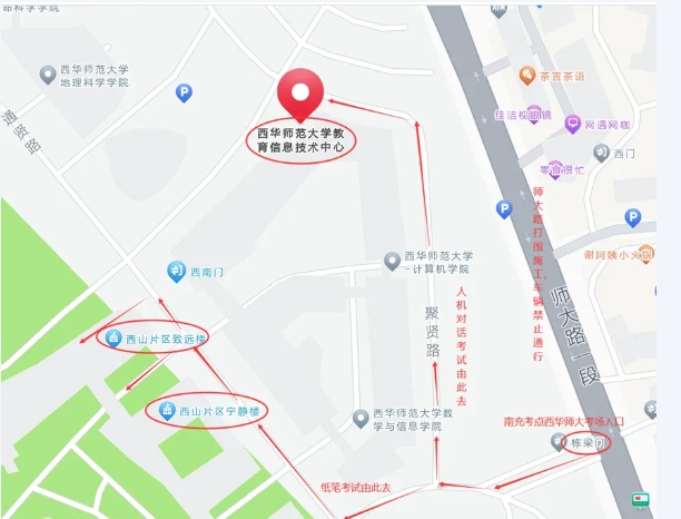 2.順慶區(qū)師大路一段因市政斷道施工車輛無法通行,考場(chǎng)內(nèi)和考場(chǎng)周邊道路無法停車。請(qǐng)各位考生務(wù)必提前熟悉考場(chǎng)附近交通路線,合理安排出行時(shí)間和出行方式,從西華師范大學(xué)棟梁門步行進(jìn)出考場(chǎng)。