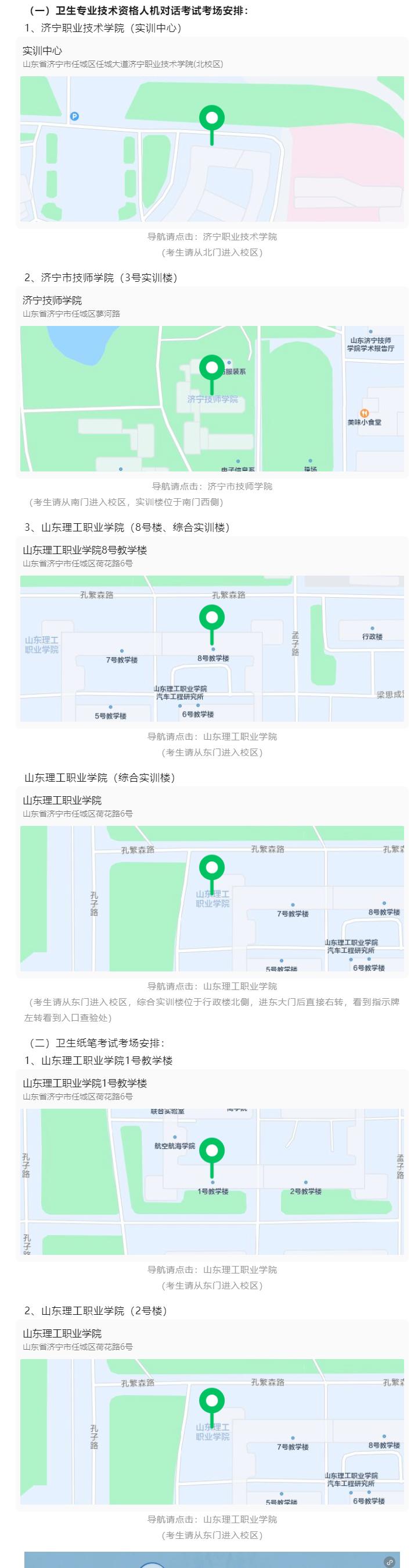 二、考試時(shí)間及科目 衛(wèi)生專業(yè)技術(shù)資格人機(jī)對(duì)話考試每天考4場(chǎng),每場(chǎng)90分鐘,具體考試時(shí)間如下: 衛(wèi)生專業(yè)技術(shù)資格紙筆考試各科目考試具體安排如下: 三、考場(chǎng)設(shè)置 (一)衛(wèi)生專業(yè)技術(shù)資格人機(jī)對(duì)話考試考場(chǎng)安排: 濟(jì)寧職業(yè)技術(shù)學(xué)院(實(shí)訓(xùn)中心) 濟(jì)寧市技師學(xué)院(3號(hào)實(shí)訓(xùn)樓) 山東理工職業(yè)學(xué)院(8號(hào)樓、綜合實(shí)訓(xùn)樓) (二)衛(wèi)生紙筆考試考場(chǎng)安排: 山東理工職業(yè)學(xué)院1號(hào)教學(xué)樓 山東理工職業(yè)學(xué)院2號(hào)教學(xué)樓 四、考試相關(guān)提醒 1、考生必須攜帶準(zhǔn)考證和有效期內(nèi)的身份證件。按照準(zhǔn)考證上規(guī)定的時(shí)間和地點(diǎn)參加考試,并仔細(xì)閱讀《考生須知》。 2、考生在考前20分鐘憑《準(zhǔn)考證》和有效身份證件進(jìn)入試室;開(kāi)考15分鐘后,考生不得進(jìn)入試室。紙筆考試全程封閉。 3、考試結(jié)束后,考試機(jī)構(gòu)將采用技術(shù)手段對(duì)試卷進(jìn)行雷同檢測(cè),對(duì)被甄別為雷同的答卷,將給予考試成績(jī)無(wú)效的處理。考試期間,請(qǐng)勿偷窺、抄襲他人作答信息,同時(shí)保管好自己的作答信息,防止被他人抄襲。 4、考試當(dāng)天考場(chǎng)無(wú)法提供停車服務(wù),請(qǐng)考生合理安排出行方式和時(shí)間。建議乘坐公共交通工具,勿自行駕車前往,以免因交通擁堵及停車等問(wèn)題耽誤考試。 五、考試紀(jì)律要求 考生應(yīng)服從工作人員管理,遵守考試紀(jì)律,如有違紀(jì)、違規(guī)行為,將依據(jù)《專業(yè)技術(shù)人員資格考試違紀(jì)違規(guī)行為處理規(guī)定》(中華人民共和國(guó)人力資源和社會(huì)保障部令第31號(hào))作出相應(yīng)處理,嚴(yán)重及特別嚴(yán)重違紀(jì)違規(guī)行為將記入專業(yè)技術(shù)人員資格考試誠(chéng)信檔案庫(kù)。 考場(chǎng)導(dǎo)航圖 具體導(dǎo)航請(qǐng)前往相關(guān)地圖軟件搜索。 >>>【應(yīng)試須知】全國(guó)2024年衛(wèi)生資格考試準(zhǔn)考證打印|應(yīng)試須知|考點(diǎn)要求