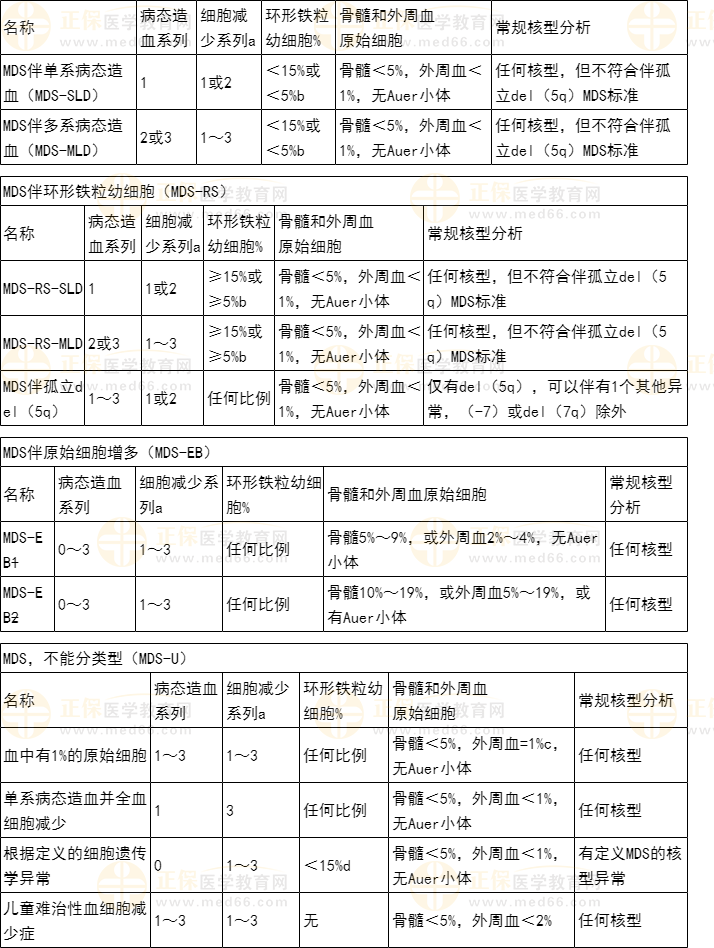 注:a.血細(xì)胞減少的定義為血紅蛋白<100g/L,血小板計數(shù)<100×109/L,中性粒細(xì)胞絕對計數(shù)<1.8×109/L;極少情況下,MDS可見這些水平以上的輕度貧血或血小板減少;外周血單核細(xì)胞必須<1×109/L;