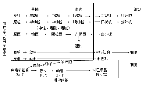 血細(xì)胞的發(fā)育成熟實(shí)際上是一個(gè)連續(xù)過程,階段的劃分是人為的措施(見下圖)。