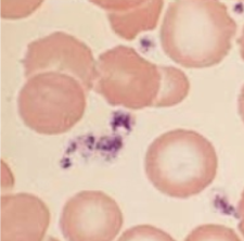 4)血小板:胞體很小,直徑僅2~4μm,呈星形、橢圓形、逗點(diǎn)狀或不規(guī)則形。胞質(zhì)染淺藍(lán)色或淡紅色,中心部位有細(xì)小紫紅色顆粒,但無細(xì)胞核。