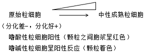 原粒胞漿光鏡下無(wú)顆粒。所以POX陰性??疾煜矚g出這類題,哪個(gè)最強(qiáng)或最弱。嗜酸陽(yáng)性反應(yīng)的程度強(qiáng)。酸梅主要兩點(diǎn);粒系相關(guān)的酶;隨著細(xì)胞成熟,陽(yáng)性反應(yīng)增強(qiáng)。
