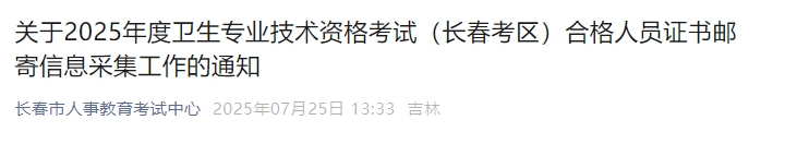 2025年度衛(wèi)生專業(yè)技術(shù)資格考試(長春考區(qū))合格人員證書郵寄信息采集工作已開始,現(xiàn)將有關(guān)事項通知如下: