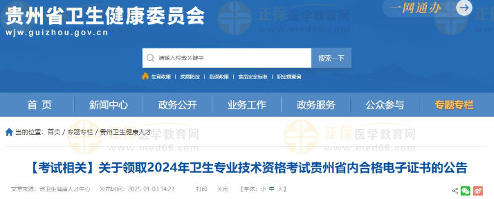 自2025年1月1日起,凡在《省衛(wèi)生健康委 省人力資源社會(huì)保障廳關(guān)于2024年度全國(guó)衛(wèi)生專(zhuān)業(yè)技術(shù)資格考試貴州省內(nèi)合格人員名單》中的考生可登錄貴州省人才人事公共服務(wù)平臺(tái)(https://rcrs.gzsrs.cn:9999/pub/#/dashboard)查詢(xún)和下載本人省內(nèi)合格電子證書(shū)。